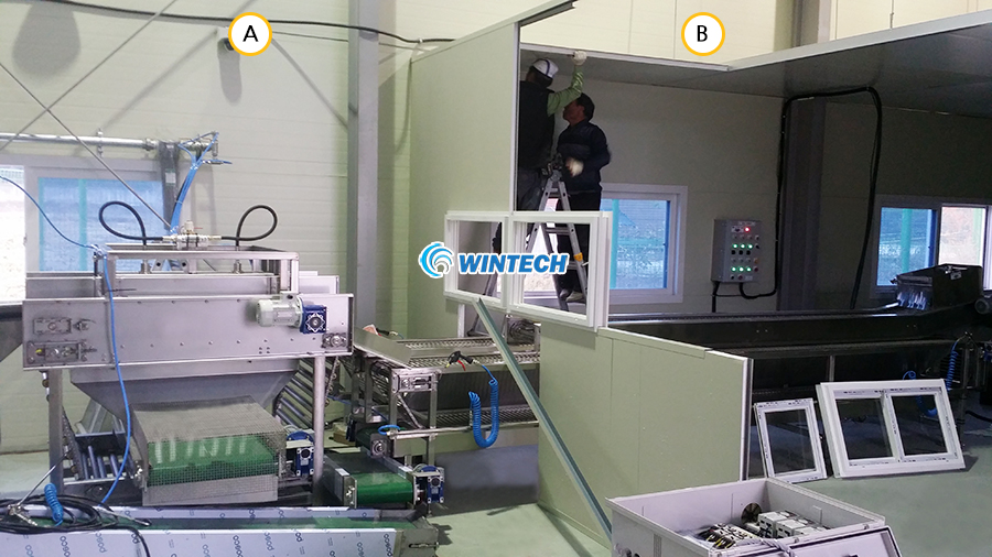 특징 : 투입/탈피실과 정선/포장실을 격실로 칸막이 공사하여 소음과 분진 냄새를 차단함으로서 정선라인, 선별라인, 포장라인의 작업환경을 쾌적하게 만들어 준다.