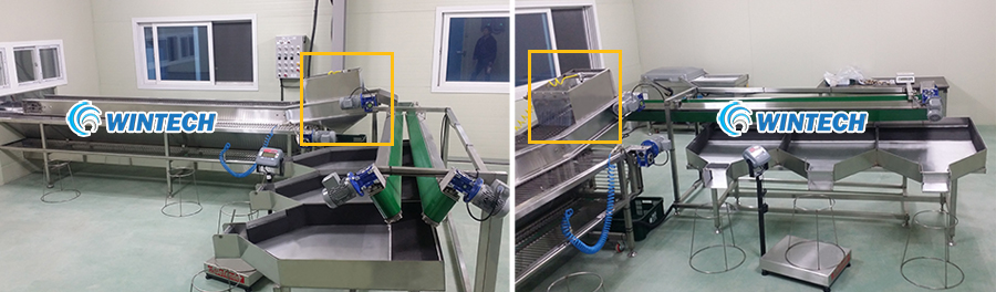 탈피기로 1차 탈피된 양파는 양쪽 컨베어로 진행하고 깐 양파 완제품을 별도로 이송하여 생산량에 따라 속도를 증/감하여 정체되지 않게 하고 오염되지 않도록 한다.